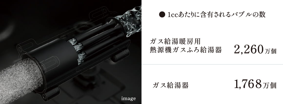 【測定条件】測定法:粒子軌跡解析法(PTA法)、測定水:純水、水温:40℃、流量:10L分、水圧:/200kPa、環境条件:常温雰囲気、平均粒径:ガス給湯暖房用熱源機・ガスふろ給湯器用125.3nm、ガス給湯器用105.2nm。リンナイ調べ。