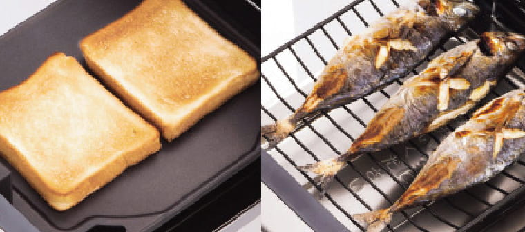 ゆとりのワイド両面焼きグリルを使って調理ができるラ・クックグラン。深めのプレートが油の飛び散りを抑え、フタ付きでニオイや油汚れも大幅にカット。