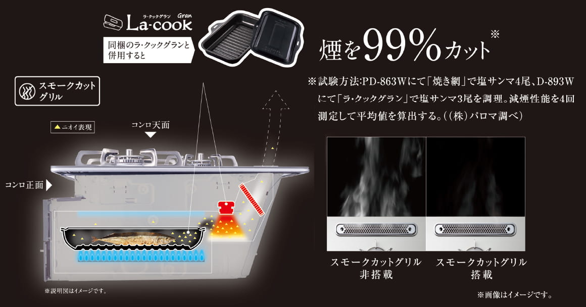 アフターバーナーで煙とニオイを大幅カット。グリルの奥に搭載されたアフターバーナーが下向きに燃焼することで、庫外に排出される煙とニオイを大幅にカット。
