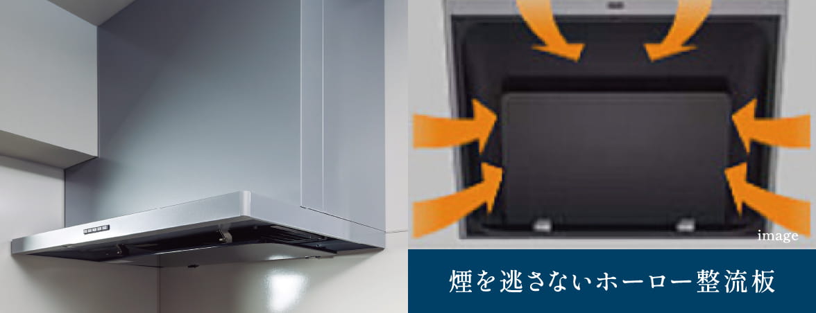 すきま風現象を利用した整流板の効果で吸引力がアップ。高品位ホーローの採用で油汚れも簡単に拭き取れます。※G・H・Iタイプはセンターフード型です。コンロ前オイルガード付。