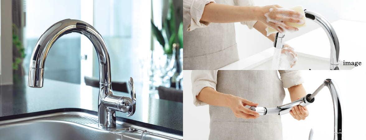 コンパクトなワンレバータイプで、水栓まわりもすっきり。ホースが伸びて思い通りに動かせます。吐水口を回すとシャワーに切り替えられます。