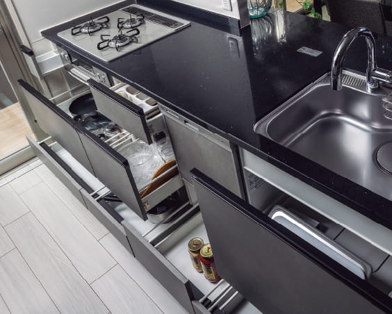 多彩なスライド収納を装備。足元までたっぷり入って、出し入れスマート。またオールスライド収納で、ラクな姿勢で使用できます。※C・Dタイプのシンク下は巾木固定タイプの引出しとなります。