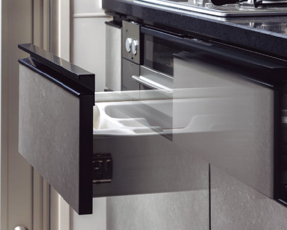 引き出しが閉まる手前で速度調節。衝撃も少なく、静かに開閉することができます。