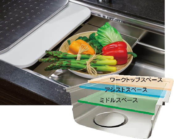 上段にはまな板や網プレートを、中段には調理プレートや水切りを設置し、便利な作業スペースを実現。キッチンスペースを有効活用できます。※CタイプはZシンクとなります。