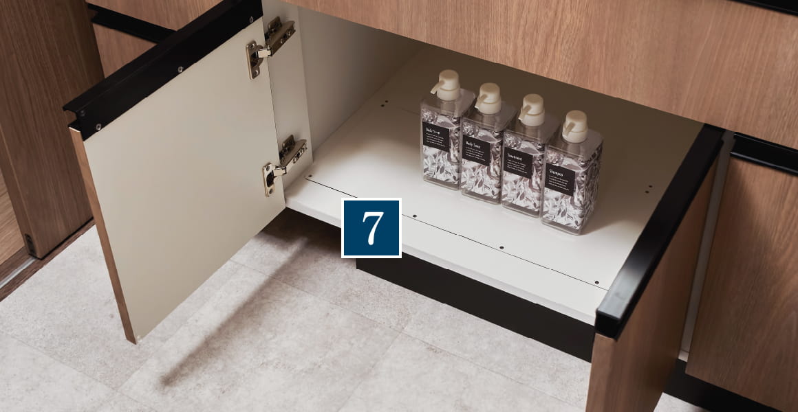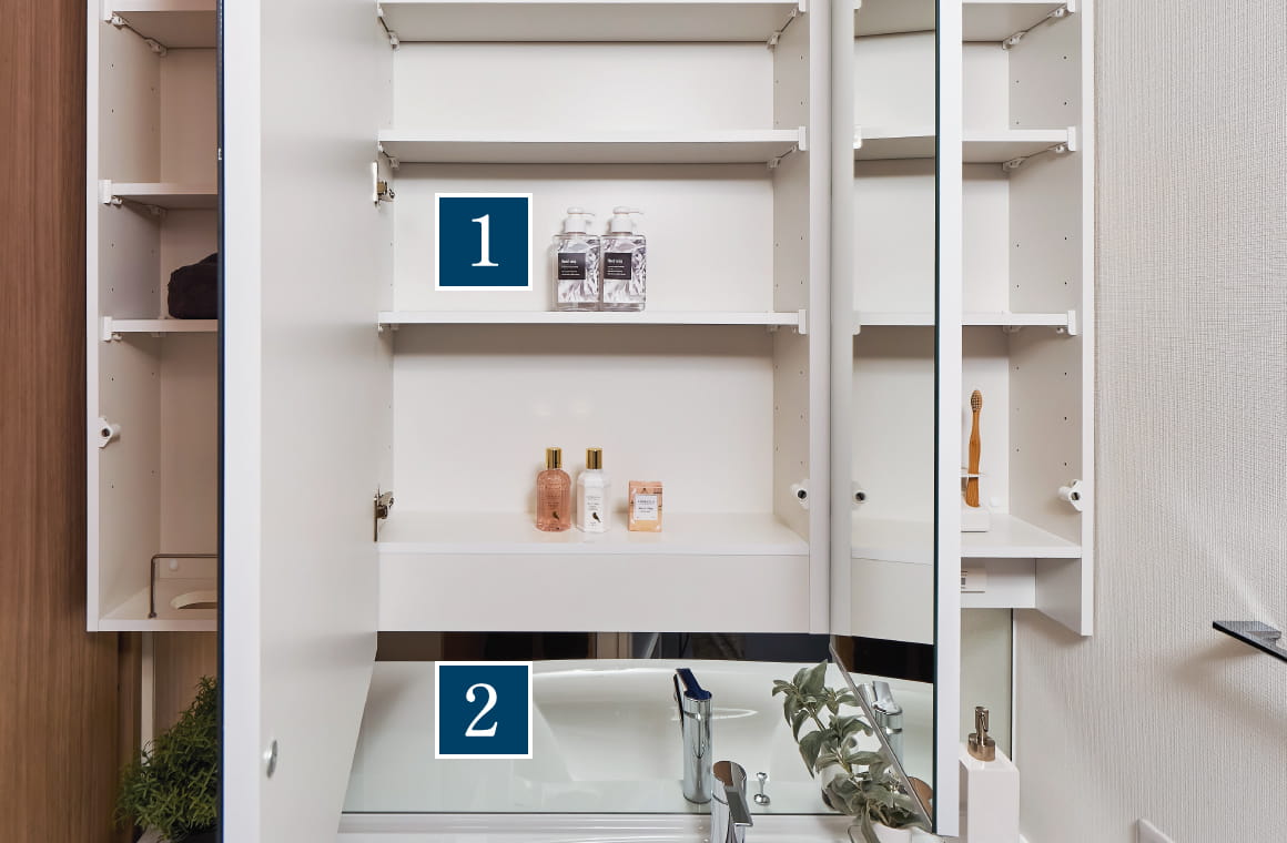 三面鏡の内部には収納棚を設けているため、スキンケア、ヘアケア用品などの洗面用具をスッキリと収納することができます。※F・G・H・Iタイプは五面鏡
