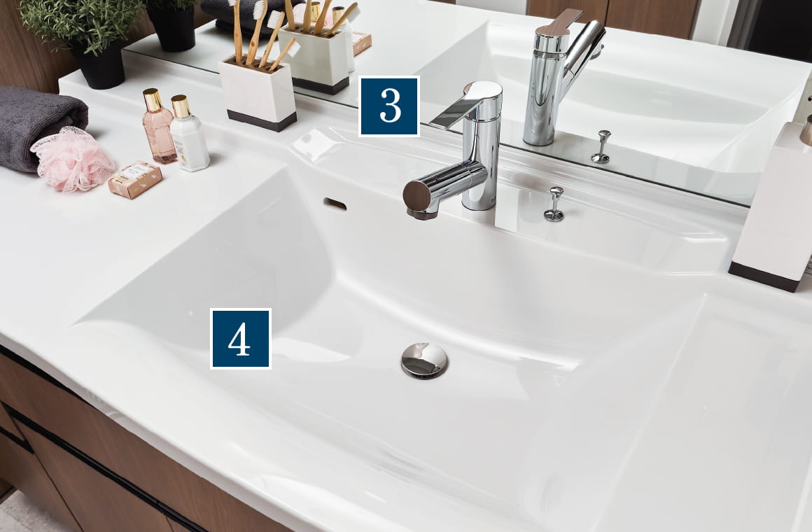 便器と同様、水アカが付きにくく落ちやすい有機ガラス系新素材で設えた手洗いユニット。スキマレス排水口を採用し、お掃除もラクラクです。