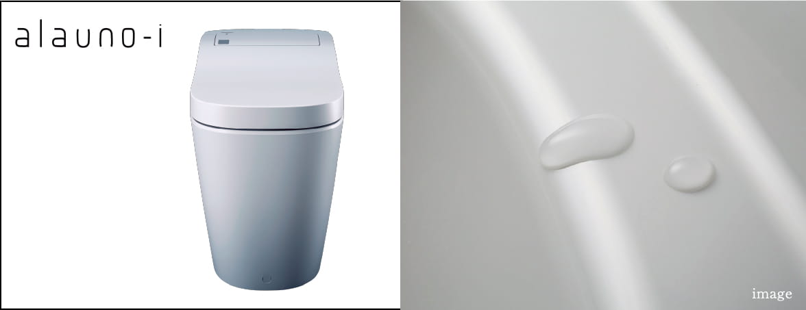 きれいが続く理由は、汚れがつきにくく落ちやすい新素材。高い平滑性と撥水性に特化している上、陶器では再現できない繊細な曲線を実現しデザイン性にも優れています。