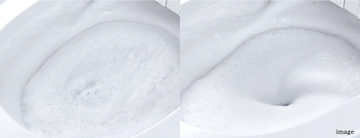 パワフルな2種類の泡がトイレを自動洗浄。水を流すたびミリバブル(気泡)で汚れをはがし、マイクロバブル(洗剤泡)で残りのわずかな汚れも除去します。