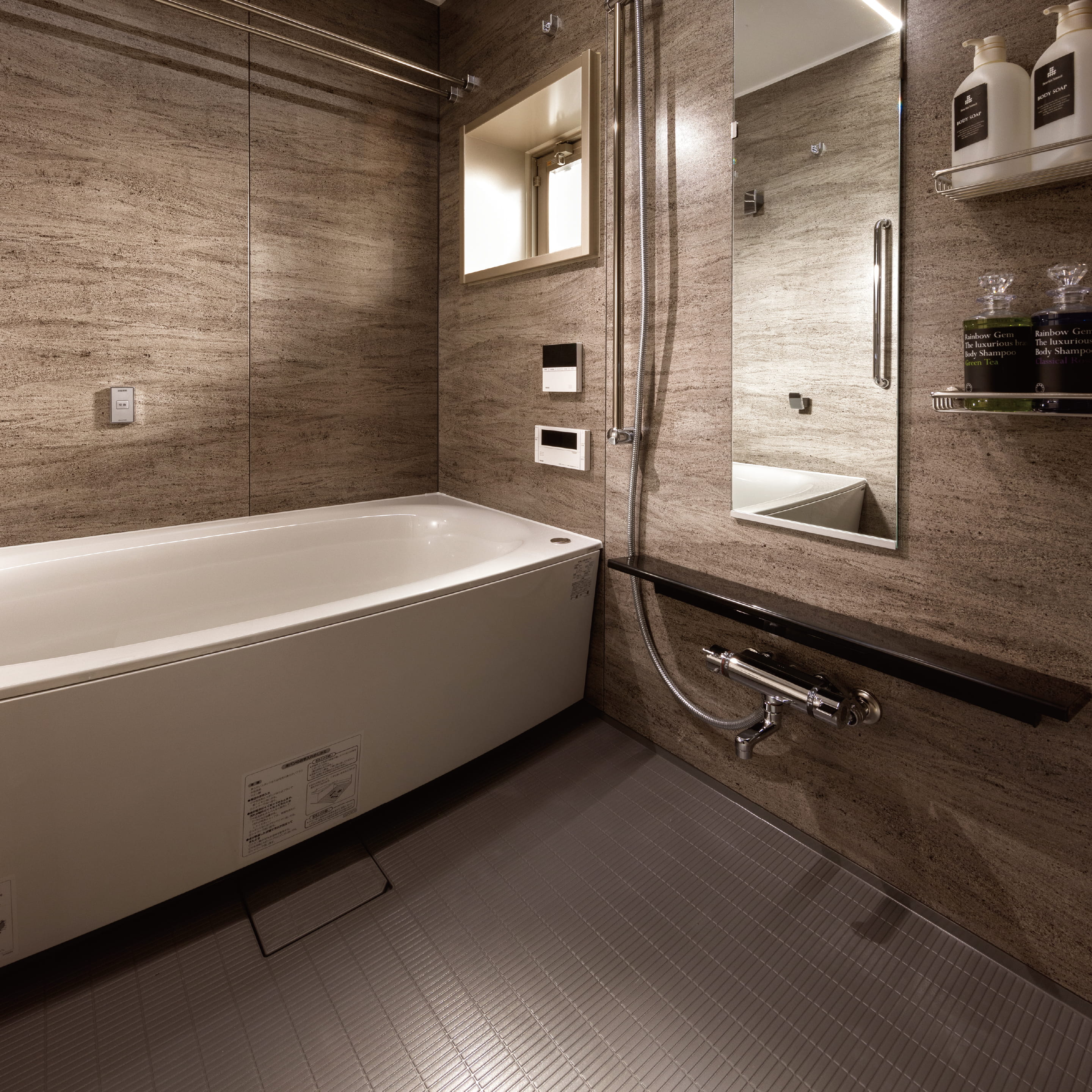 ユニットバスの壁には高級感のある美しいパネルを採用。清掃性が高く、汚れのつきにくい材質なので、表面の汚れはシャワーでさっと流すだけでキレイに。