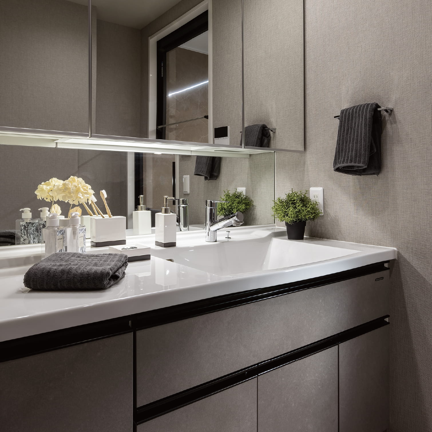 低い位置にも鏡を設置。小さなお子さまでも顔を映すことができます。さらに空間の広がりを演出し、より一層の爽快感が得られます。