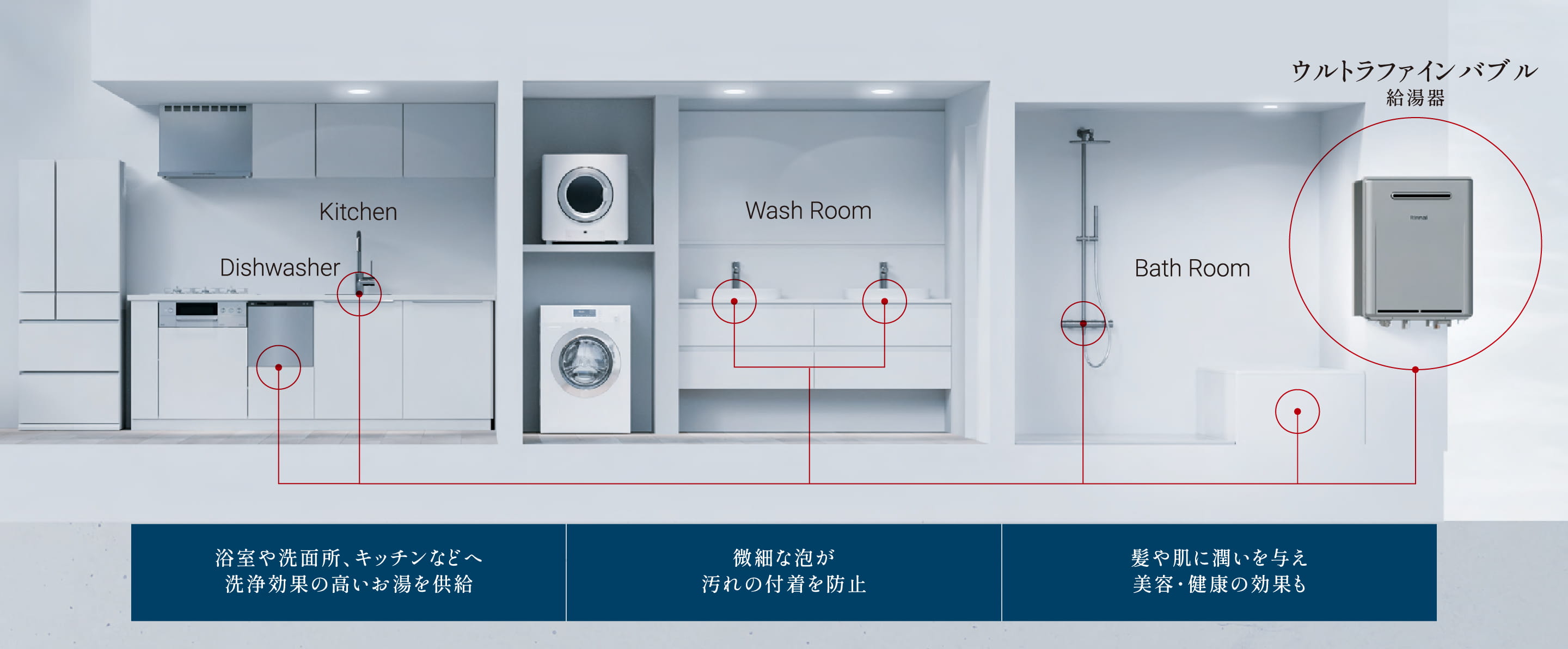 直径1マイクロメートル未満の微細な泡を水に溶け込ませる、Rinnai独自技術。その洗浄効果から幅広い分野で活用されています。長年の研究を重ねて開発された、このテクノロジーは、マイクロバブルバスユニットやウルトラファインバブル給湯器に使われています。
