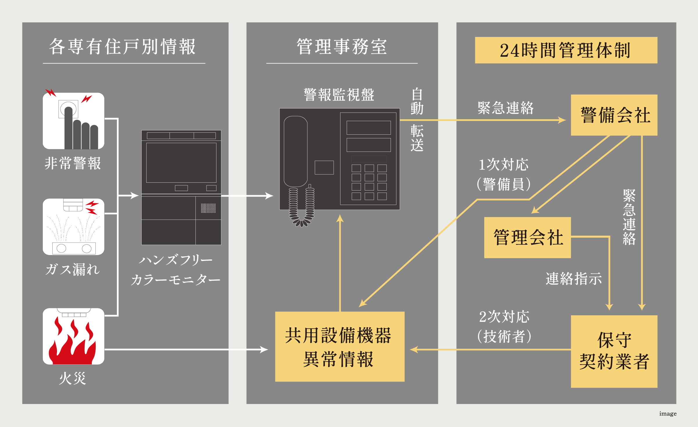 ガス漏れや火災といった住戸内の非常事態を感知すると、自動的に警報監視盤に通報し、警備会社が迅速に対応する24時間セキュリティシステムを採用して、住まう方の安全と安心をサポート致します。