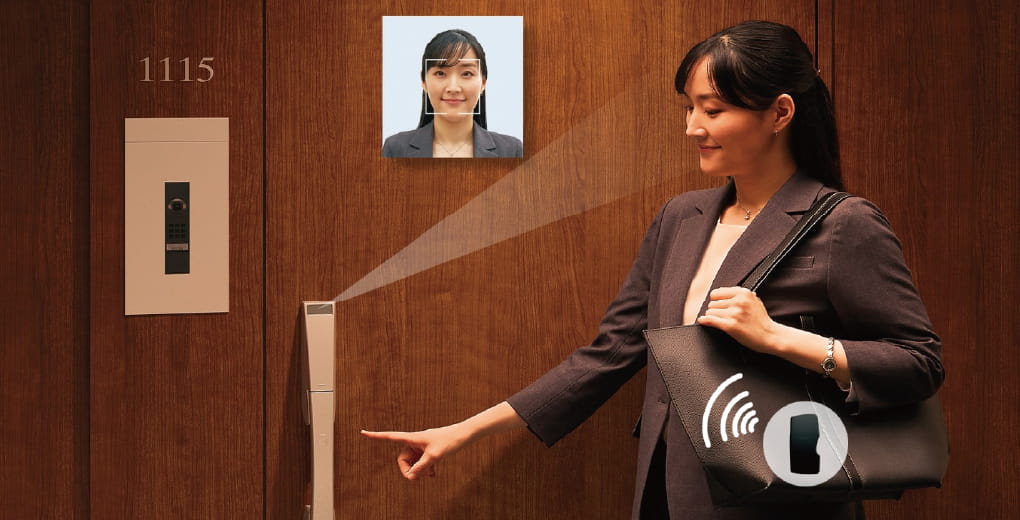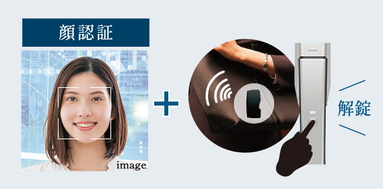 住戸玄関のカメラに顔を向け認証ボタンを押すだけで、登録されている顔と照合し、施解錠ができます。