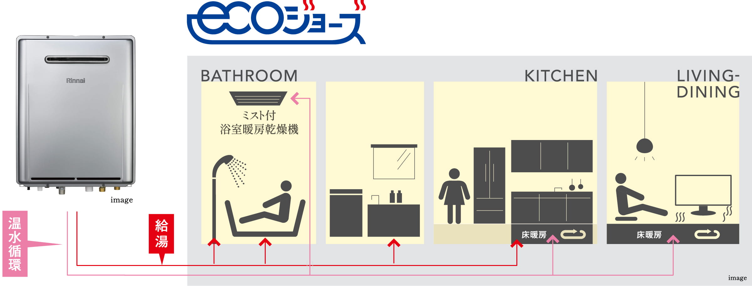 給湯器上部から空気中に排出する約200℃の排気熱を再利用。熱効率を約95%(従来は約80%)にまで引き上げたエコジョーズは、CO2排出量を約13%カット。熱効率が上がった分、ガスの使用量が少なくなり、従来の給湯器に比べ、ガス料金が軽減されとても効率的。環境とともに家計にも優しい給湯システムです。