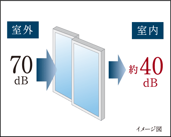 ※T-2サッシとは、サッシ標準寸法単体でのJIS遮音性能であり、おおむね30dBの性能を有する事ですが、実際は諸条件(窓の数や、開口部の大きさ等)により低下する場合があります。