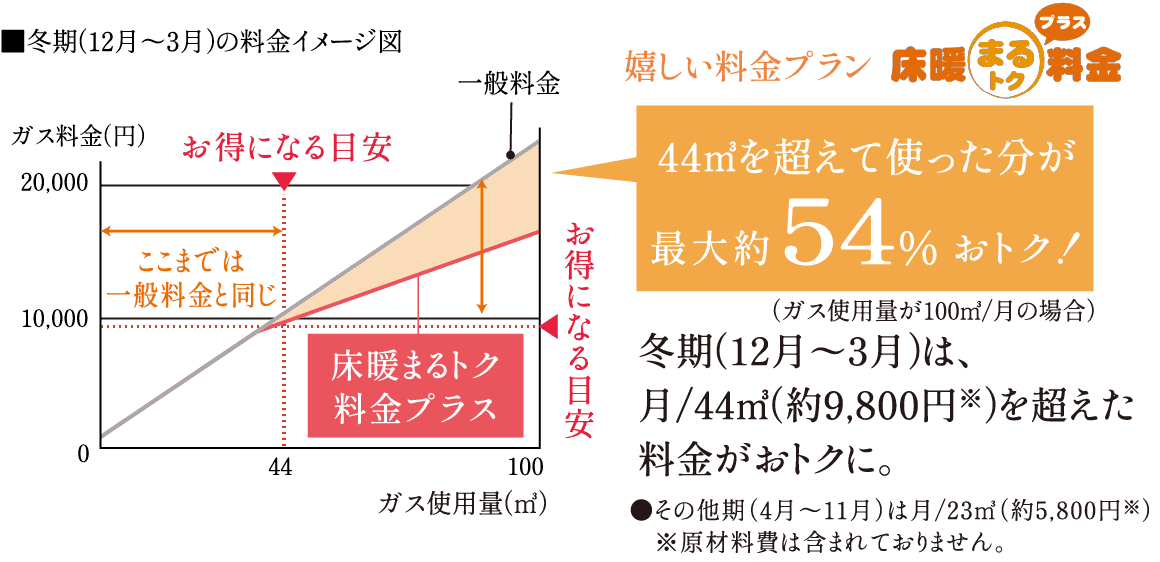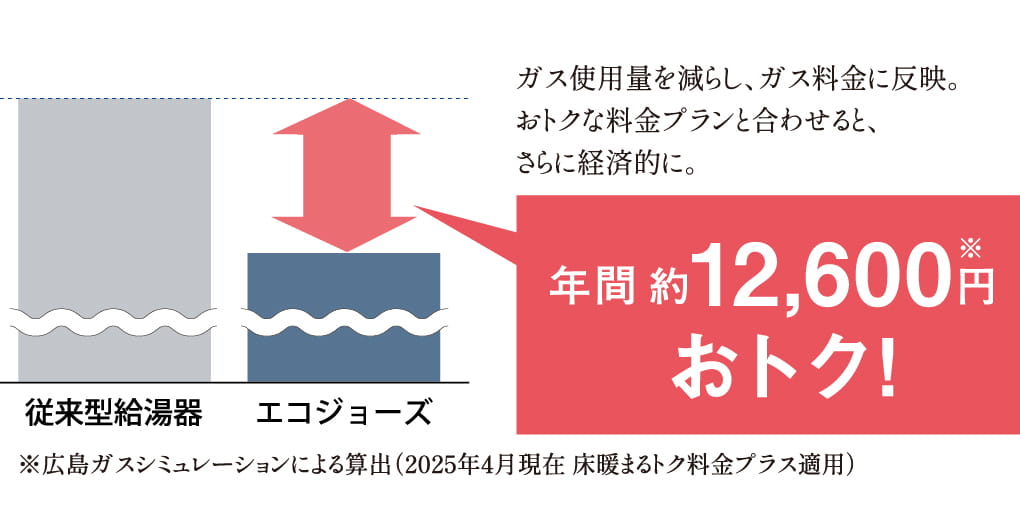【適用料金】ガス、電気ともに2025年4月分単位料金を適用(原料費調整費、消費税込)従来型給湯器、エコジョーズともに床暖房まるトク料金プラス、広島ガス電気エコプランM