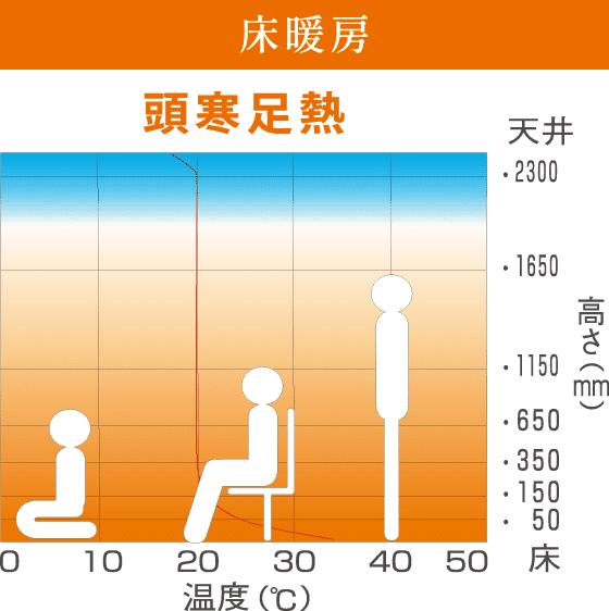 床暖房は、足元から体をしっかり温め、床面からのふく射熱で部屋全体をおだやかに暖めます。頭寒足熱が保たれて、長時間過ごしても快適です。