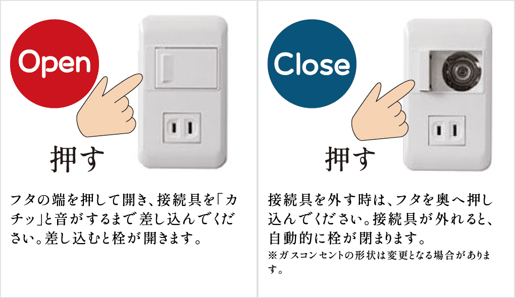 埋込形ガスコンセントはワンタッチで「カチッ」とするだけで簡単に接続できます。