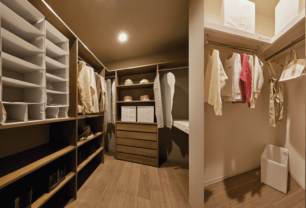 収納力の高いウォークインクローゼットを全タイプに設置。衣類から生活小物まで、効率よくたっぷりと収納できます。トイレに吊戸棚を設置。プランバリエーションの中には広めの収納スペースを設けたプランもご用意。