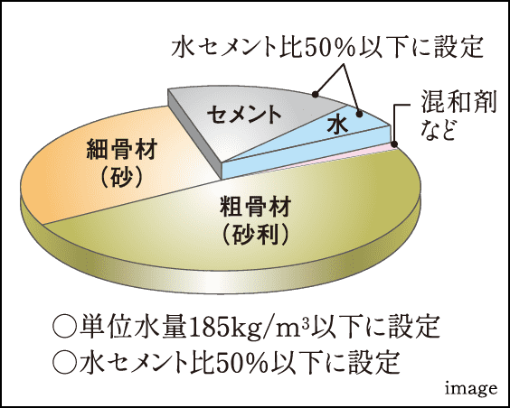 建物の耐久性を左右するコンクリートの劣化を防ぐために、単位水量・水セメント比の基準を設定し、配合段階で劣化軽減対策をとっています。