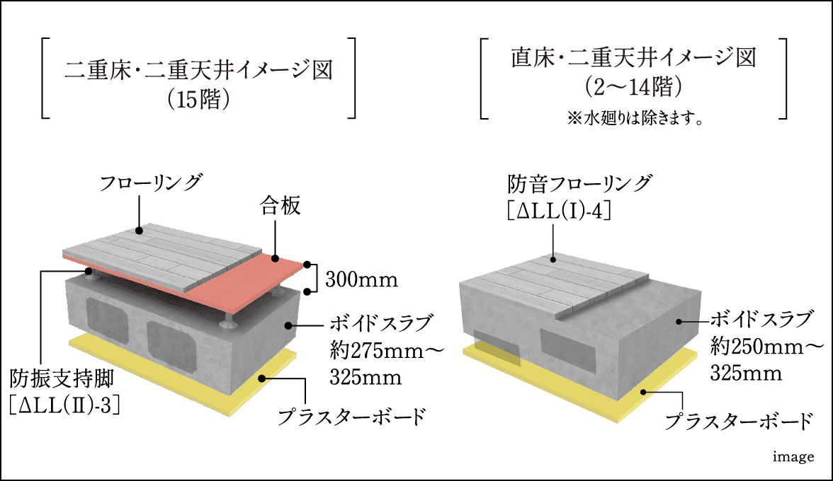 上下階から発生する生活音の伝わりを防ぐため、全戸で約250mm〜325mm厚(15階約275mm〜325mm厚)のボイドスラブおよび二重天井を採用。最上階には二重床を採用しました。※一部を除く