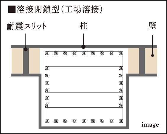 柱のコンクリート内部の鉄筋に、つなぎ目を溶接した閉鎖型フープ筋を採用。柱構造の粘り強さを向上させます。