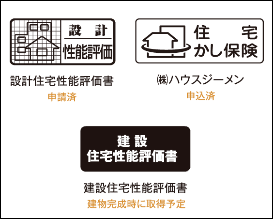 耐震性や耐久性等、あらゆる建物の基本性能を国土交通大臣登録の第三者機関が評価する住宅性能評価書を申請中。さらに新築住宅の10年保証をサポートする瑕疵保険にも申込済ですから万一の際も安心です。