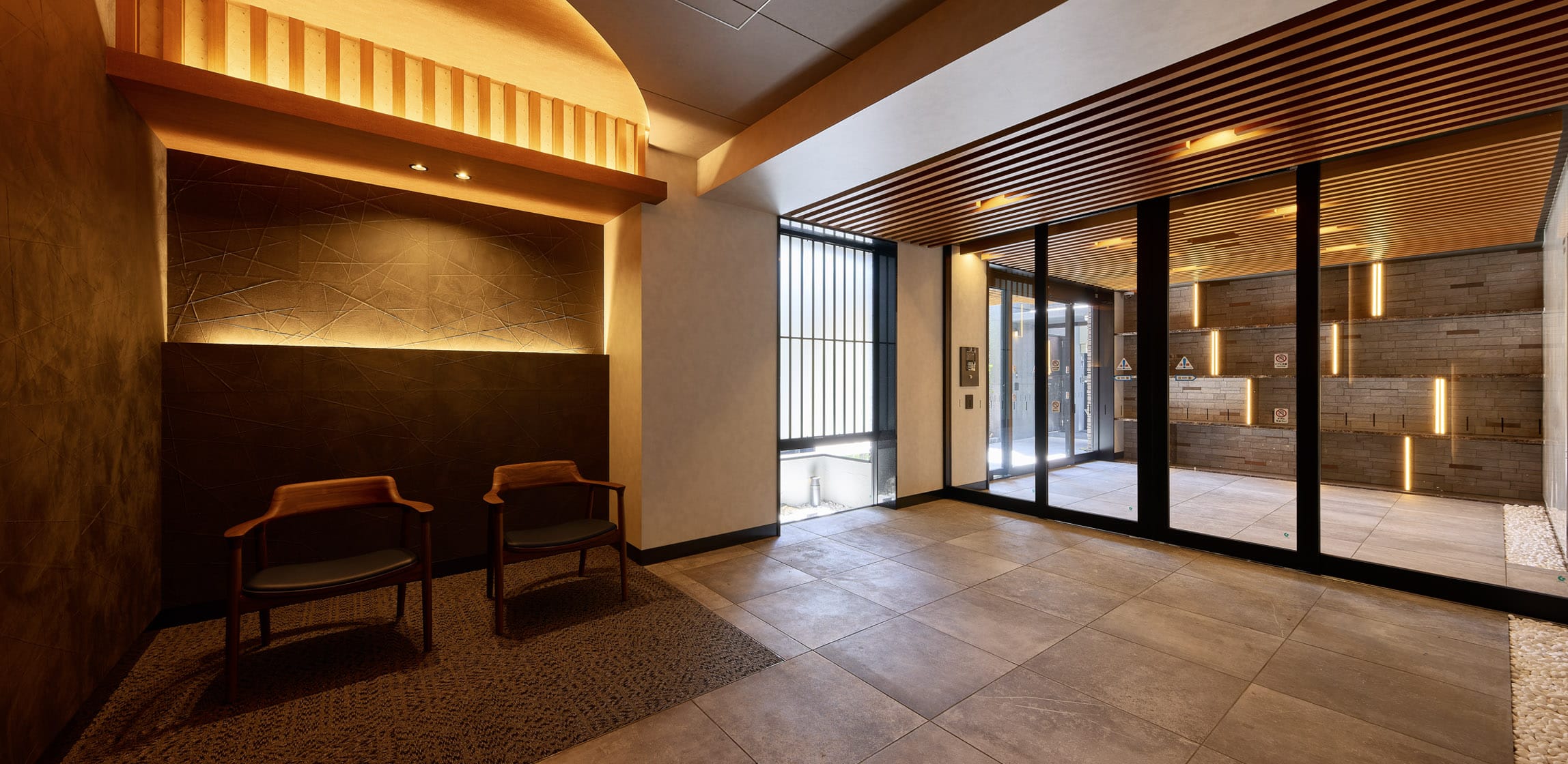 木調の縦格子とともに落ち着いた雰囲気を醸成します。