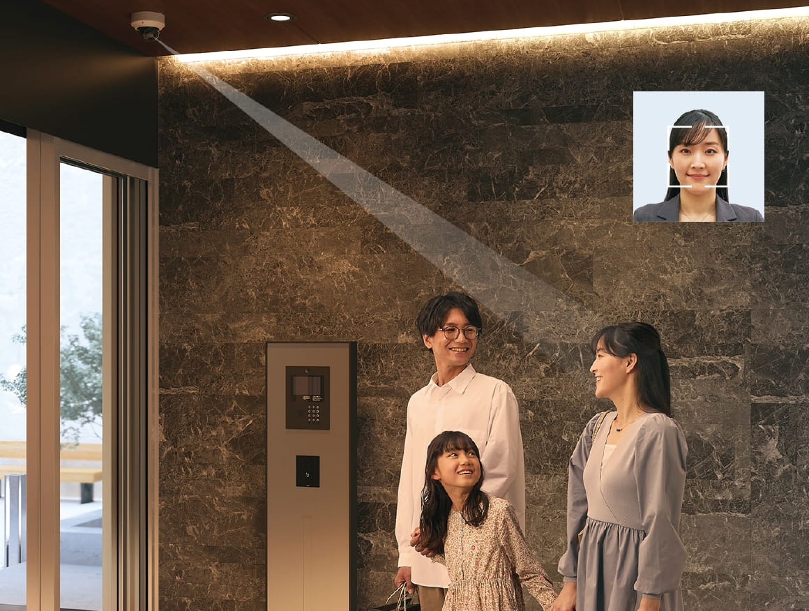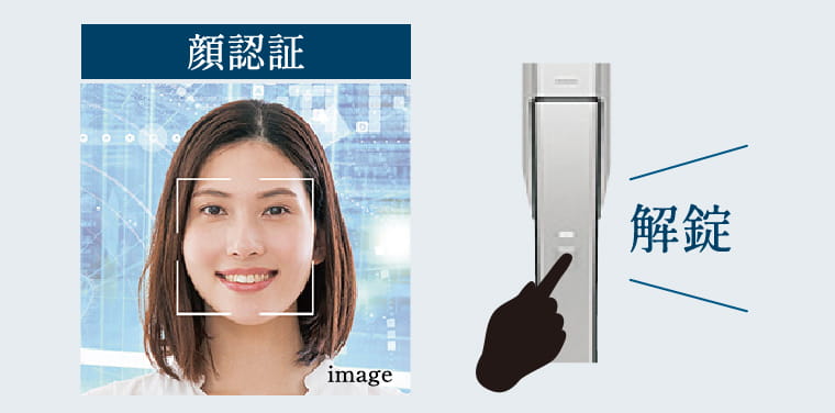 住戸玄関のカメラに顔を向け認証ボタンを押すだけで、登録されている顔と照合し、施解錠ができます。