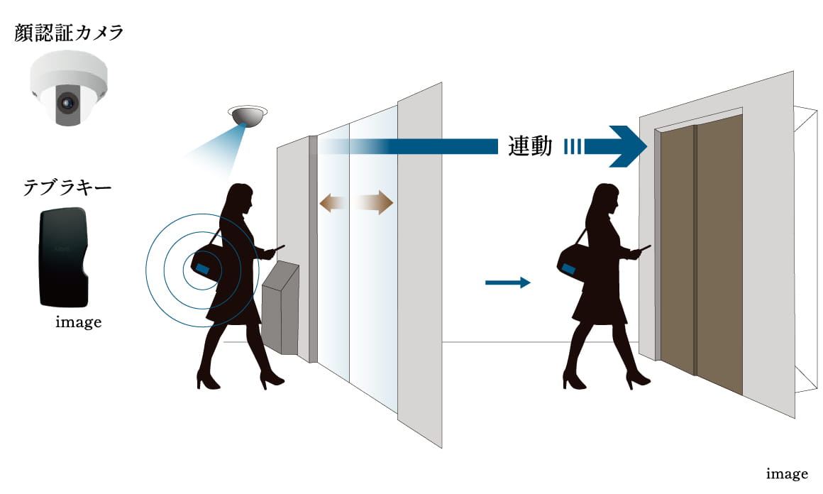認証カメラでの顔認証、またはテブラキーをカバンやポケットに入れたままエントランスのドアが開きます。