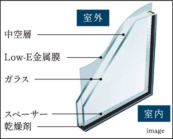 ガラスを特殊な金属膜「Low-E膜」でコーティングすることによって暖かい太陽光を取り込み、室内の暖房熱を逃さない複層ガラスです。冷暖房効果をあげるとともに冷暖房費も節約。また、結露の発生も抑えます。
