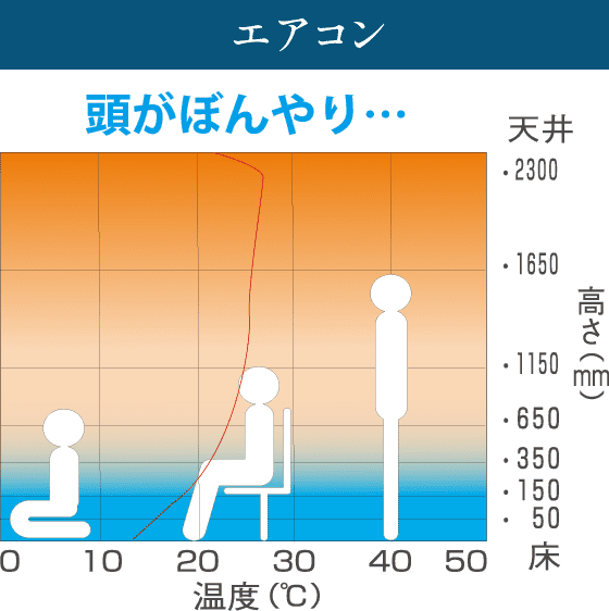 暖められた空気が上昇して天井近くは約27℃、床は約15℃と頭がボーっとし足元は冷え冷え。空気を暖めても壁や床に熱を奪われてしまいます。