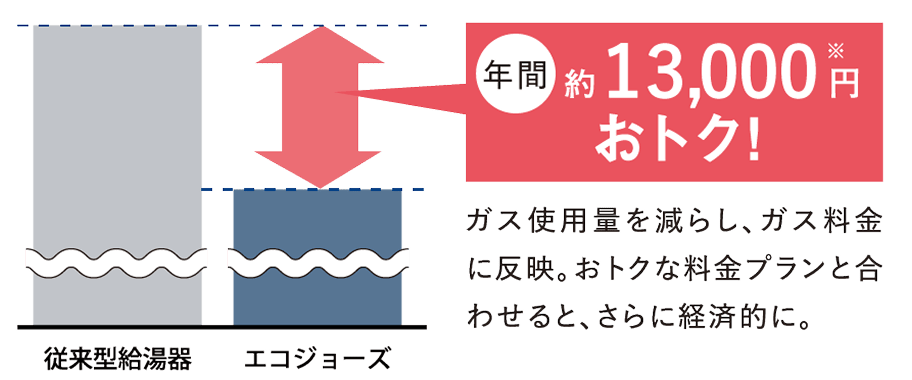 給湯器上部から空気中に排出する約200℃の排気熱を再利用。熱効率を約95%(従来は約80%)にまで引き上げたエコジョーズは、CO2排出量を約13%カット。熱効率が上がった分、ガスの使用量が少なくなり、従来の給湯器に比べ、ガス料金が軽減されとても効率的。環境とともに家計にも優しい給湯システムです。