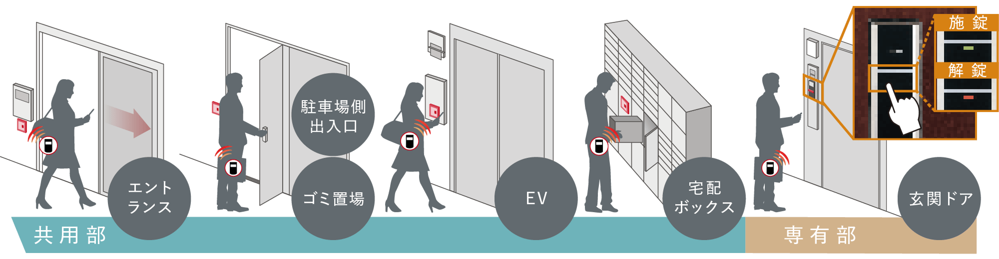 共用部・専有部ともにハンズフリーシステムを採用。エントランス、駐輪場入口、バイク置場入口では鍵をポケットや鞄に入れたまま、リーダの前を横切るか自動ドアに近づくと人感センサが検知しTebraキーを認証すると自動ドアが開きます。宅配ボックスではリーダに手をかざし認証すると操作が可能になります。また、エレベーター※はTebraキーを認証すると居住階が自動で登録されます。各住戸前ではボタンを押すだけで、解錠することができます。